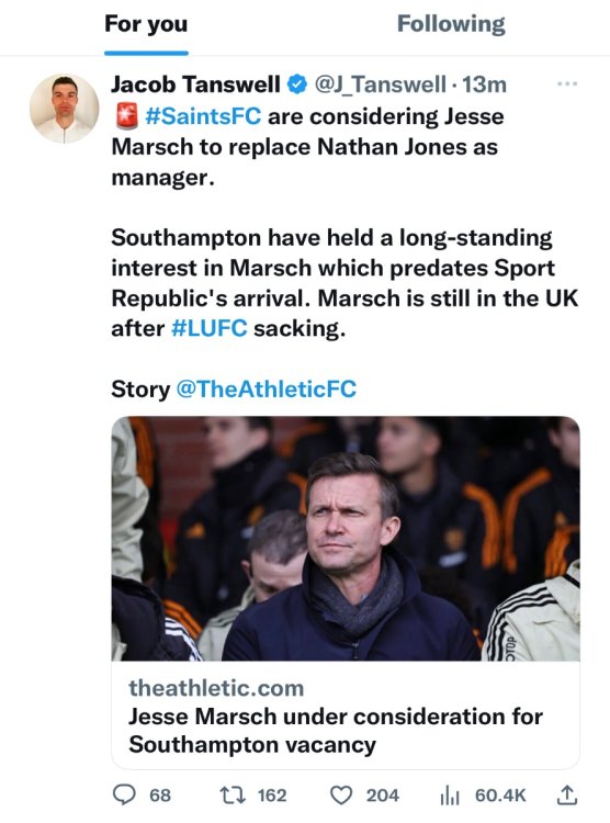 True. But Marsch? Played all his “soccer in US Micky Mouse leagues and then managed in a franchise. And then he really sorted Leeds out. No thanks but this has got SR all over it and the fact the Athletic are running it fills me with despair.
