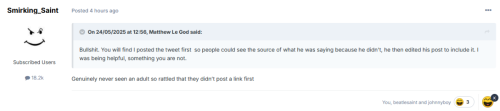1) As above. "Thanks for confirming you dropped all mention of players after being found out last time. Also for running away from the other points." I've not mentioned Spors and you're just sadly deflecting away from having been embarrassed the last time you went down this path. 2) The first couple of mocking responses that come to hand below. I can't think of a single time you've put "bullshit" in one of your posts that ever made you anything other than more wrong. Such a child.
