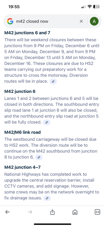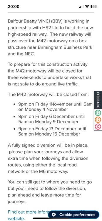 For those being brave and travelling to Villa Park, when on M42 last week, noted M42 is closed the entire weekend between junctions 6 (NEC/Airport) and 7 (M6) for HS2 infrastructure works. See photos attached. Weather not looking great either. Still have 2 tickets available see Saints Away channel.