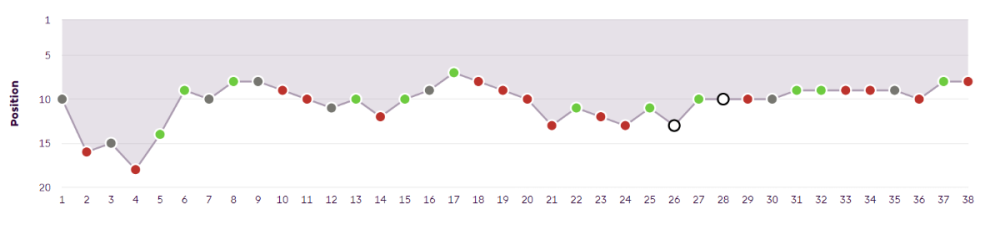 So pretty much the same as we have been this season? No. 10th after 15 games with 20 points and a zero goal difference. Goals scored per game 1.08 vs 0.73 this. Goals conceded 1,26 vs 2.07 With 12 wins in total by the beginning of April they took their foot off (probably still after being robbed at Wembley) and had a poor run of form after. I'll take boring in retrospect for sure.