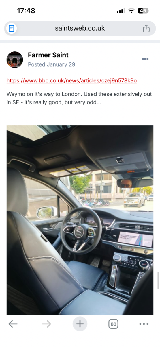Sir Ralph Posted 2 minutes ago Posted 2 minutes ago 3 minutes ago, Farmer Saint said: That's a Waymo I took in San Francisco you fucking idiot. It's an automated driving taxi. What a twat. Yep I have this time. Oh well.
