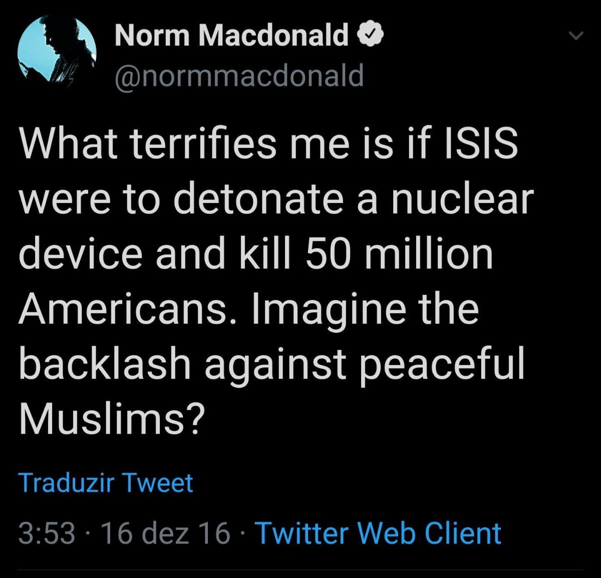 hypochondriac Posted Friday at 11:43 Posted Friday at 11:43 2 minutes ago, egg said: That's nonsensical flapping and incitement. ISIS can't just get their hands on a nuke. It's a ten year old joke from a dead comedian.