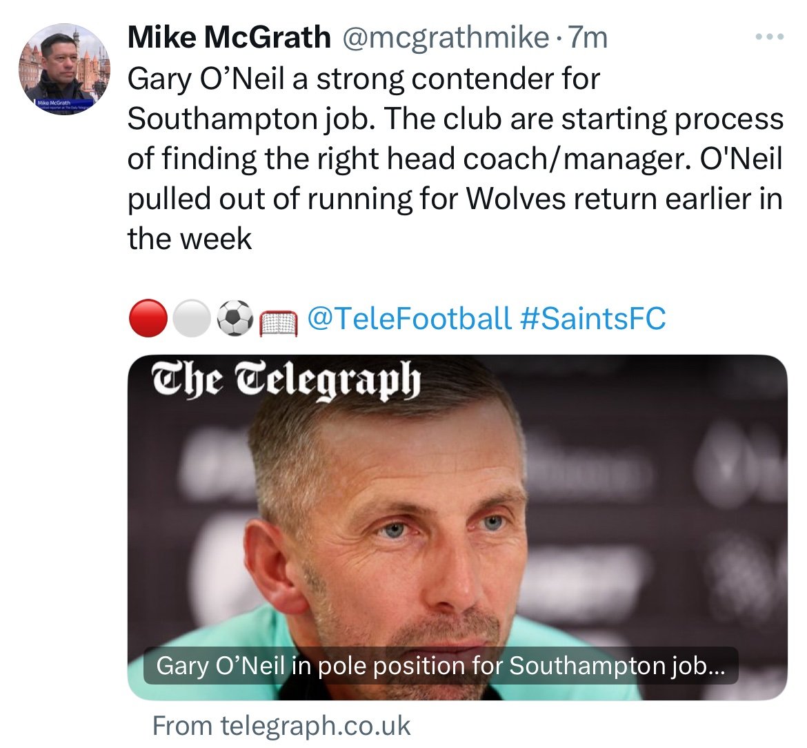 goodymatt Posted 1 hour ago Posted 1 hour ago ”While O’Neil is a contender for the job, it is still early in the process for Southampton.” ”Other managers, including Michael Carrick, have a strong reputation in the Championship and could come into the running, with the former England midfielder reaching the play-offs once with Middlesbrough during his three seasons at the club.”