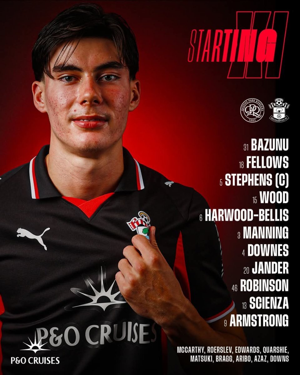 CSA96 Posted 3 hours ago Posted 3 hours ago (edited) Saints (3-4-2-1): Bazunu; Harwood-Bellis, Stephens, Wood; Fellows, Jander, Downes, Manning; Scienza, Robinson; Armstrong Bench: McCarthy, Roerslev, Edwards, Quarshie, Aribo, Bragg, Matsuki, Azaz, Downs Edited 3 hours ago by CSA96