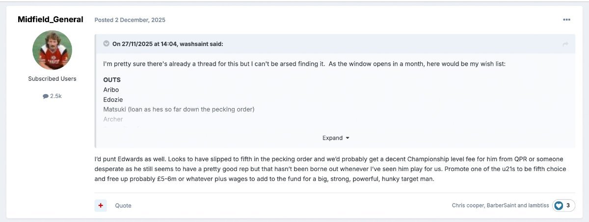 HarvSFC Posted 14 hours ago Posted 14 hours ago Edwards is a necessary sale. Can't keep hanging onto these players in the hope that one day they will become good, as spoken about before we need to be more ruthless with our squad management and those who aren't up to the standard should be shown the door. Alongside this £4.5m adds to our funds from the summer and isn't a bad fee at this level. As we all know the summer of 2024 went wrong because we signed a load of squad players instead of improving the first eleven. Going as far as to sign two squad centre-backs in Wood and Edwards at the time. Both young, but a year and a half later and Edwards is no closer to the first team than the day he signed and has lacked any physicality and pace when played this season, which we're lacking across the team so there isn't anybody to cover up for his deficiencies here. At the end of the day, I don't think we'll ever have a good defence if Edwards is part of it and we need to be aiming higher. 1