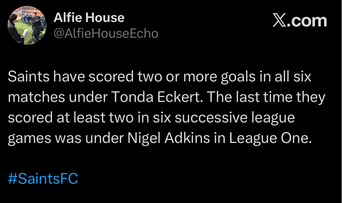 Saint NL Posted 2 hours ago Posted 2 hours ago A weird half. We looked very good in parts, but somehow the 2-0 flatters us a bit. Brum look like they could score from every cross that comes in, yet Bazunu hasn't made a save. Tonda has the easiest team talk in the league - "Just give the ball to Scienza"