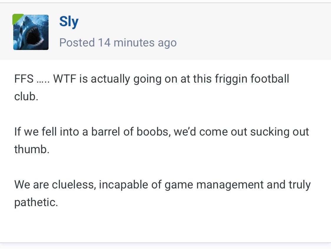 Sir Ralph Posted 1 hour ago Posted 1 hour ago (edited) 10 minutes ago, egg said: Behave. Starting Archer wasn't wise, but it may have been a Stewart fitness thing. Starting Jander and Fellows wasn't a mistake though. But starting archer was the key issue. We had no option to get out from the press. I cannot comprehend how he hasn’t understood that from the last couple of months. It’s obvious when I looked at the team sheet that was going to be a problem. On the positive the players seem to have developed guts over the past couple of games which we haven’t seen for a long time Edited 1 hour ago by Sir Ralph 2 2