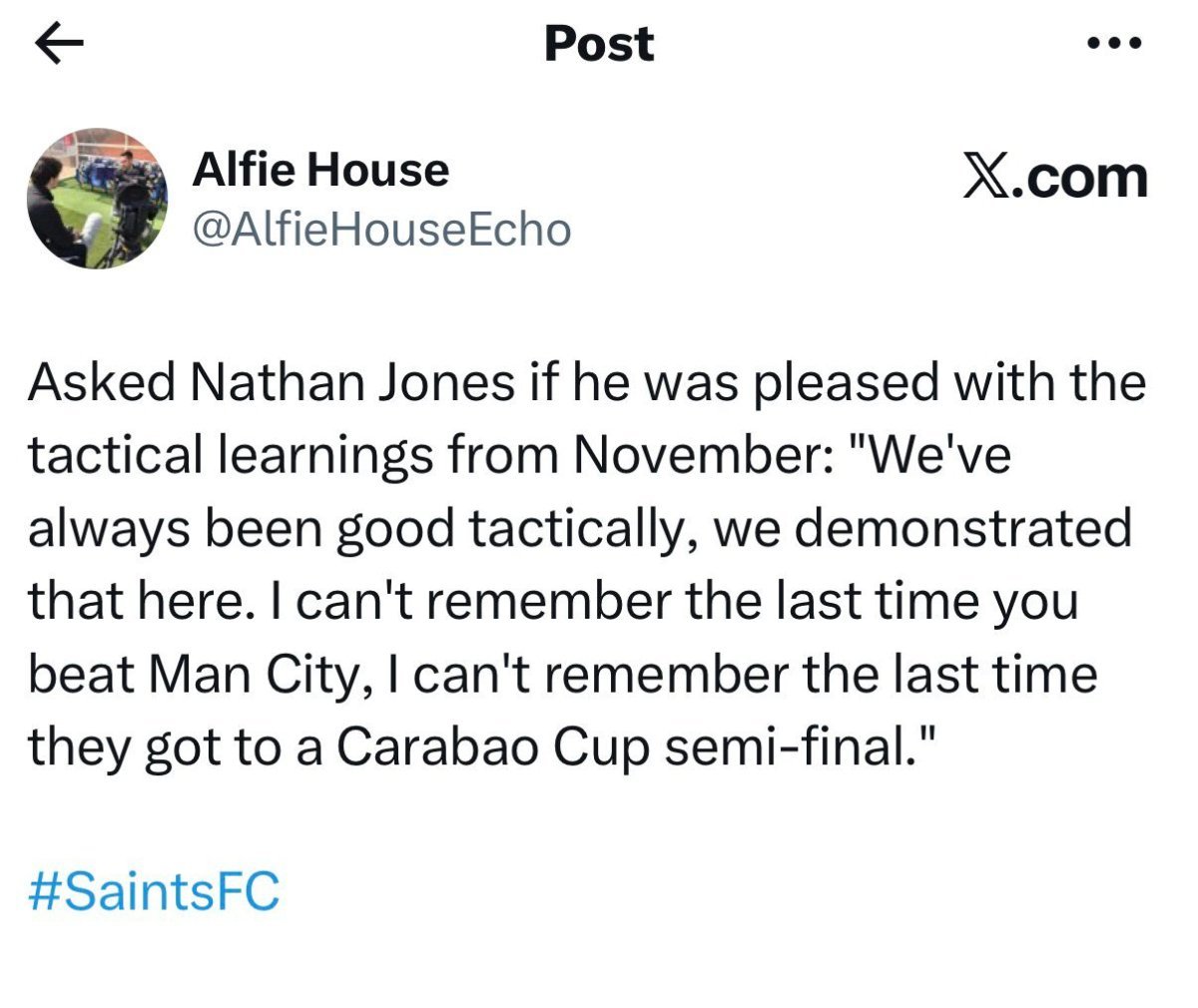 tdmickey3 Posted 3 hours ago Posted 3 hours ago 1 minute ago, saintant said: Charlton have had a real mixed bag of results but there have been some good victories. For example they beat Ipswich 3-0 at Portman Road. Doesn't help us but teams are generally not going to just roll over against us. We're a decent side but not that good that we should routinely expect to beat every team that rocks up at St Marys. We've seen that it's been a season full of upsets and unexpected results. We're not exempt from dropping points when we all expect a win. There are still play-off places up for grabs - if we play to our potential we have a decent chance of continuing to be one of those challenging but all teams will drop points in a disappointing fashion. We don’t play to our potential enough, that is the problem and aligned with a tactically limited coach this is what you get
