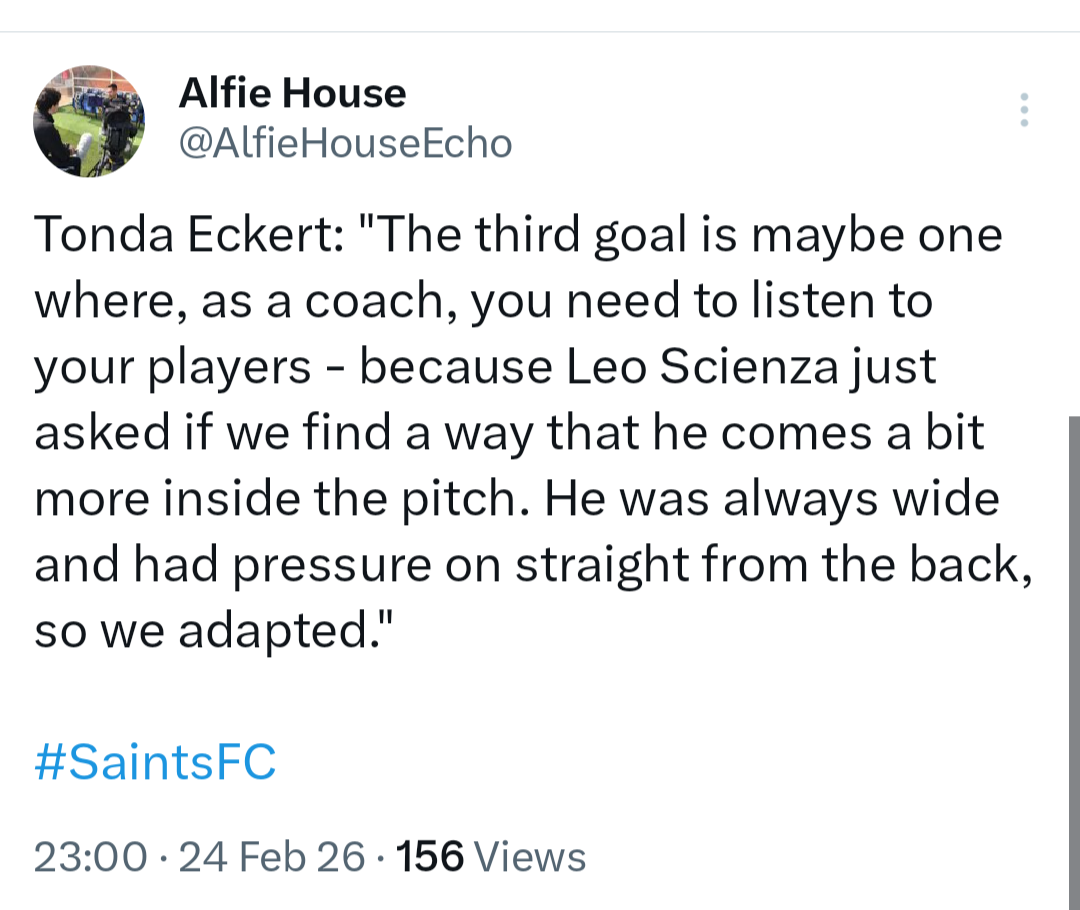 SaintBobby Posted 5 minutes ago Posted 5 minutes ago 1 hour ago, Willo of Whiteley said: Well that was a game of two halves. We were pretty crap in the first half, well taken goal by Azaz but then he went awol until half time. Matsuki was decent and then he popped up with that header. I said to my Dad that first goal after half time would be the decider, after that third went in they were done. It was one way traffic. On another day we could’ve easily got another two or three. Larin was excellent with his hold up play; in fact most of the team went up a level in the second half. We need to push that momentum through now. You thought the 3rd goal would decide the outcome. But you also thought Saints could have easily scored 7 or 8?